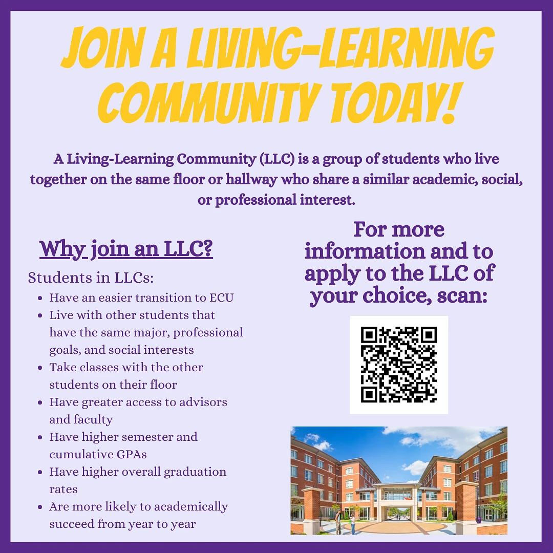 An LLC is a group of students who live together on campus, sharing the same floor or hallway, and who have common academic, social, or professional interests. Students in an LLC typically take one or two classes together and are invited to participate in special programs and events tailored to their interests. Additionally, they benefit from increased access to faculty and staff outside the classroom. ECU offers 14 distinct LLCs that your student can apply to join!