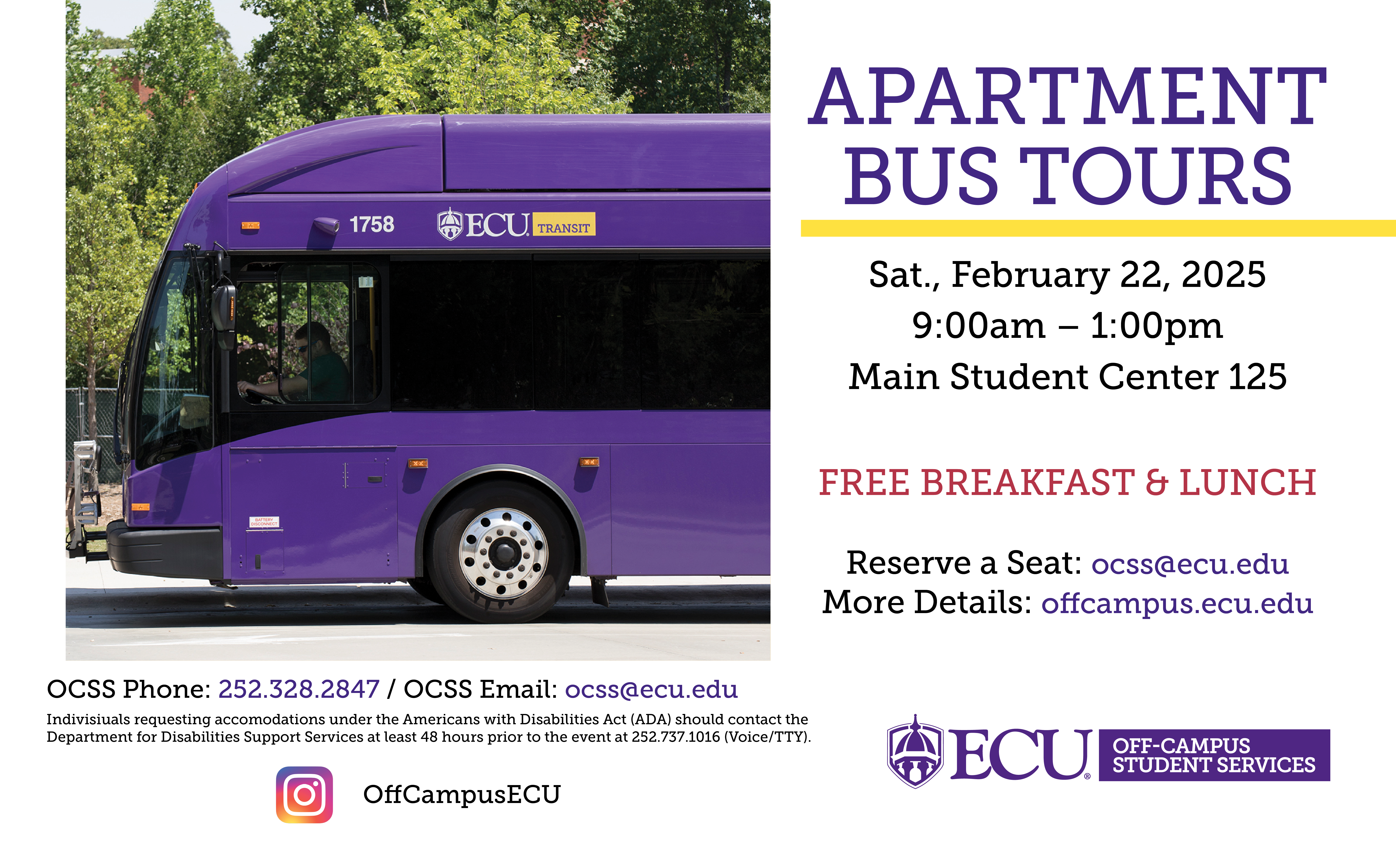 Students can send an e-mail to ocss@ecu.edu with subject Apartment Bus Tour or call 252-328-2847. FREE breakfast and lunch will be provided.
